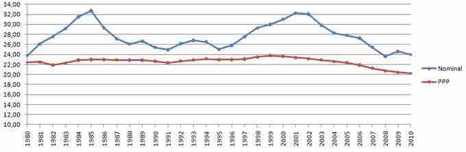 The United States' share of world GDP (nominal) peaked in 1985 with 32.74% of global GDP (nominal). The second highest share was 32.24% in 2001. Note that it is been declining since then.
