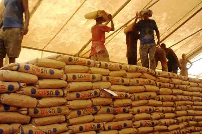 Aid workers from USAID (the United States Agency for International Development) distribute food to Kenya during a food crisis.