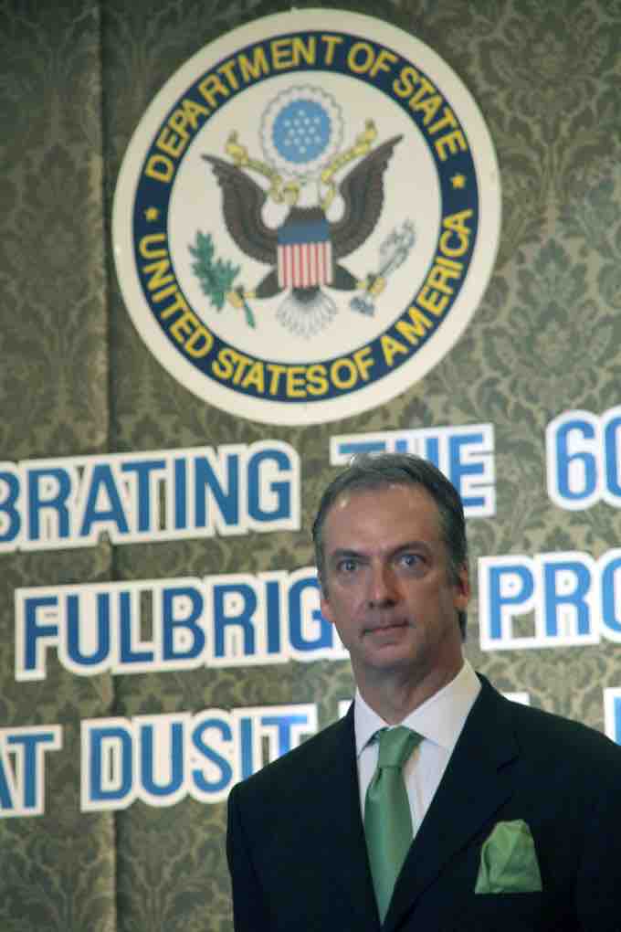 Eric G. John, the U.S. Ambassador to Thailand from 2007-2010, speaks at a reception for Fulbright Grantees in Thailand. As an ambassador and formal representative of the U.S. government, John addresses traditional, elite-to-elite diplomacy, while the Fulbright program emphasizes public diplomacy.