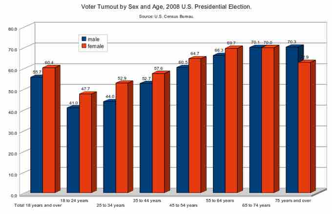 This is a chart illustrating voter turnout by sex and age for the 2008 U.S. Presidential Election using data from the U.S. Census Bureau. Notice the higher turnout rates for women, and for older people.