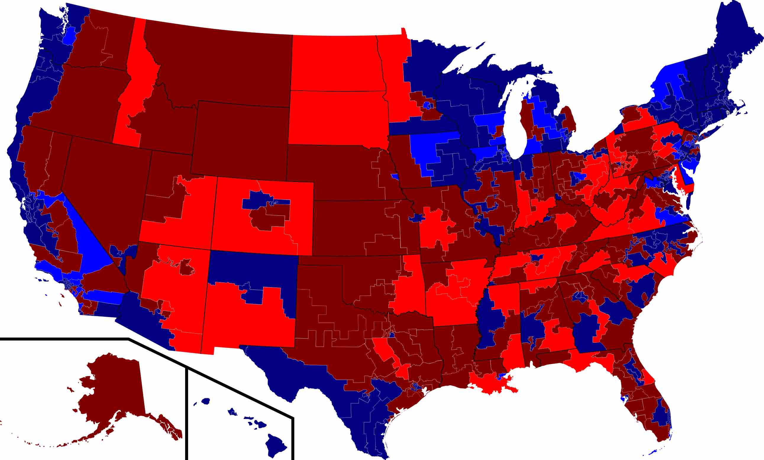 This chart indicates the results of the 2008 presidential election. Dark red districts supported Republican for President and Congress; red districts supported a Republican for President, and Democrat for Congress. Dark blue indicates districts that supported Democrat for President and Congress; blue indicates districts that supported Democrat for President and a Republican for Congress.