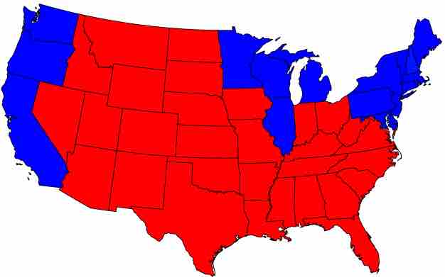 This map of the different party strength in the 2004 Presidential Election (red states voted Republican and blue states voted Democrat) demonstrates the relationship between political socialization and geography.