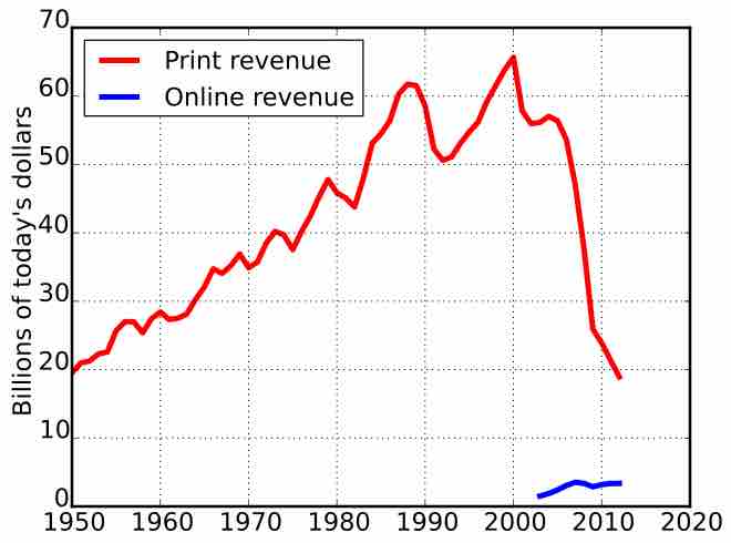This graph depicts the fall of print advertising revenue and the rise of online advertising revenue.