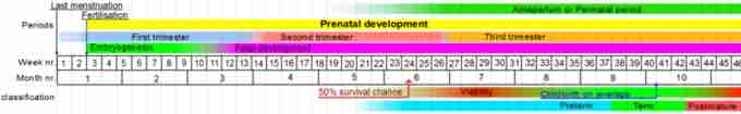 Prenatal development is the process that occurs during the 40 weeks prior to the birth of a child. There are three stages of prenatal development: germinal, embryonic, and fetal. Prenatal development is also organized into three equal trimesters, which do not correspond with the three stages. The first trimester ends with the end of the embryonic stage, the second trimester ends at week 20, and the third trimester ends at birth.