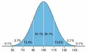 The scores of an IQ test are normally distributed so that one standard deviation is equal to 15 points; that is to say, when you go one standard deviation above the mean of 100, you get a score of 115. When you go one standard deviation below the mean, you get a score of 85. Two standard deviations are 30 points above or below the mean, three are 45 points, and so on. So by current measurement standards, 68% of people score between 85 and 115, 95% of the population score between 70 and 130 points, and over 99% of the population score between 55 and 145.