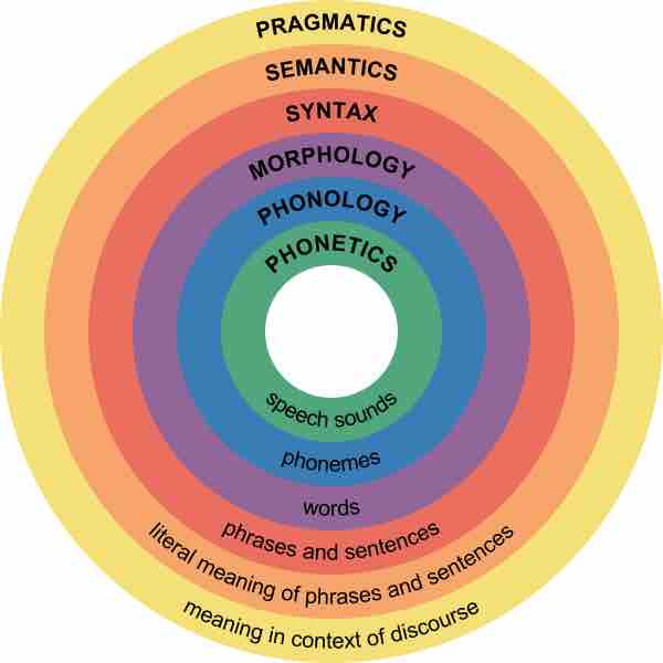This diagram outlines the various subfields of linguistics, the study of language. These include phonetics, phonology, morphology, syntax, semantics, and pragmatics.