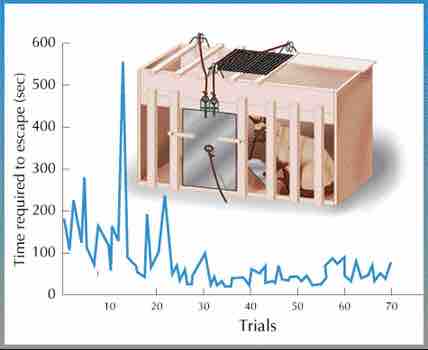 This image shows an example of Thorndike's puzzle box alongside a graph demonstrating the learning of a cat within the box. As the number of trials increased, the cats were able to escape more quickly by learning.