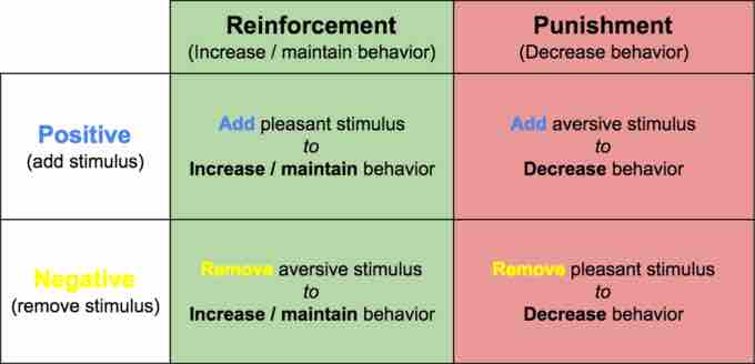 In the context of operant conditioning, whether you are reinforcing or punishing a behavior, "positive" always means you are adding a stimulus (not necessarily a good one), and "negative" always means you are removing a stimulus (not necessarily a bad one. See the blue text and yellow text above, which represent positive and negative, respectively. Similarly, reinforcement always means you are increasing (or maintaining) the level of a behavior, and punishment always means you are decreasing the level of a behavior. See the green and red backgrounds above, which represent reinforcement and punishment, respectively.