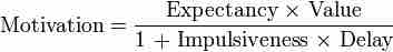 In this equation, motivation is the desire for a particular outcome. Expectancy, or self-efficacy, is the likelihood of success; value is the reward associated with the outcome; impulsiveness is the individual's ability to withstand urges; and delay is the amount of time until the realization of the outcome (i.e., the deadline). The greater the individual's expectancy for successfully completing the task, and the higher the value of the outcome associated with it, the higher the individual's motivation will be. In contrast, both impulsivity and a greater amount of time before a deadline tend to reduce motivation.