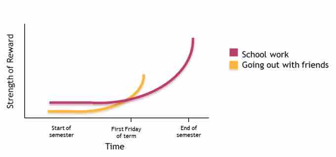 Consider a student who is given one month to study for a final exam. Throughout the month, the student has two options: studying or socializing. The student enjoys socializing but needs to achieve a good grade. At the beginning of the student's study period (where there is a long delay before the deadline), the reward of studying is not immediate (and therefore has low value); therefore, the motivation to study is lower than the motivation to socialize. However, as the study period diminishes from several weeks to several days, the motivation to study will surpass the motivation to socialize.