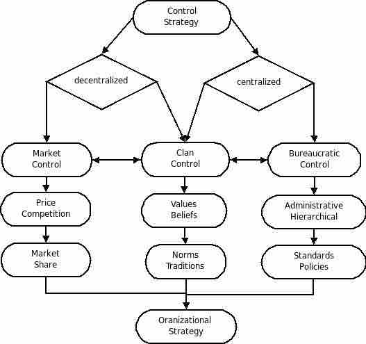 Control Theory in sociology can either be classified as centralized, decentralized, or mixed. Decentralized control, or market control, is typically maintained through factors such as price, competition, or market share. Centralized control, such as bureaucratic control, is typically maintained through administrative or hierarchical techniques that create standards or policies. An example of mixed control is clan control, which contains both centralized and decentralized control. Mixed control is typically maintained by establishing a set of values and beliefs or norms and traditions.