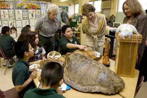 Laura Bush listens to a student talk about sea turtles during a 2006 visit to Banyan Elementary School in Miami, FL, in support of education about parks and the environment.