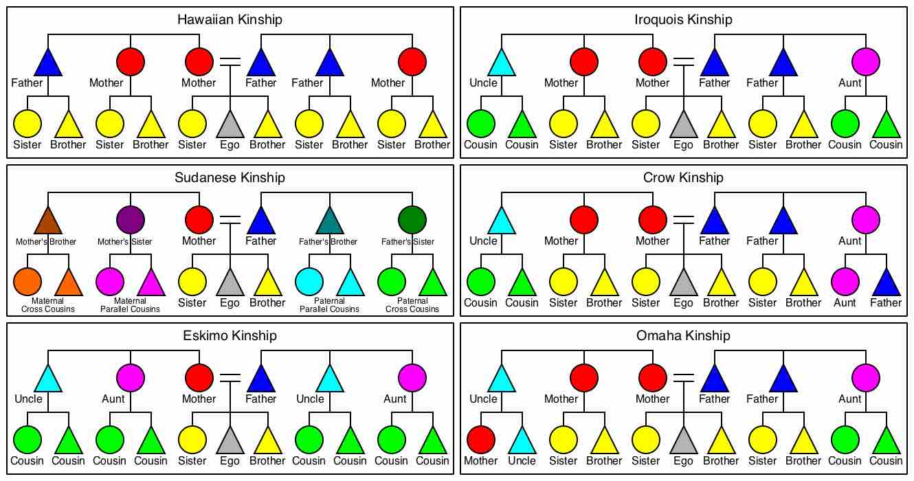 A broad comparison of (left, top-to-bottom) Hawaiian, Sudanese, Eskimo, (right, top-to-bottom) Iroquois, Crow and Omaha kinship systems.