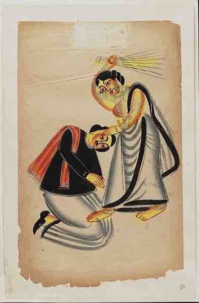 Kalighat Painting, "Woman Striking Man With Broom," Calcutta, India, 1875.