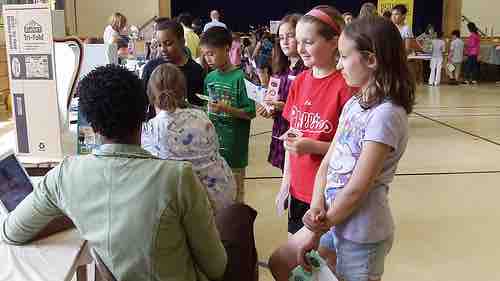 A group of girls and boys working on a science project together at Cheltenham Elementary School, Cheltenham, PA, USA