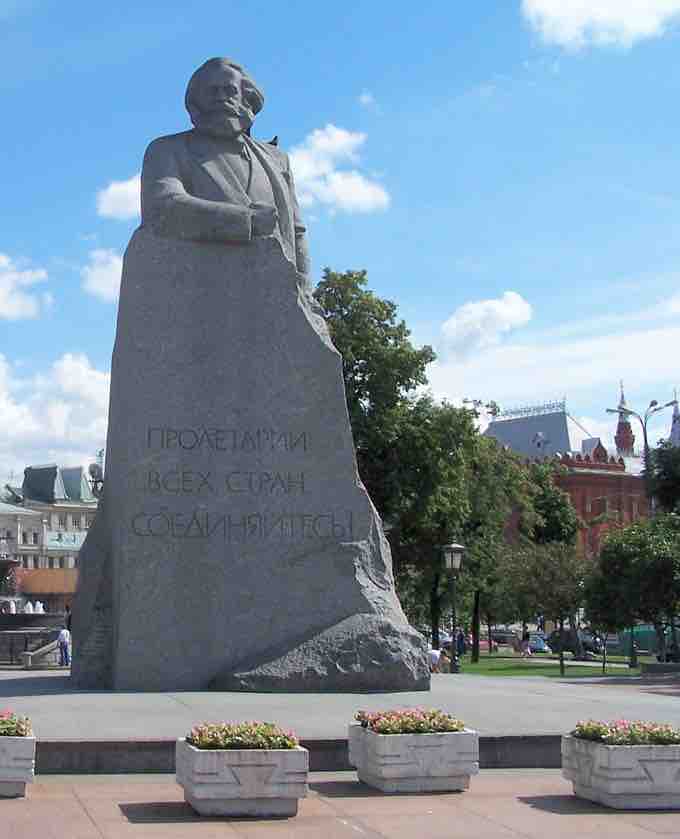 This memorial to Karl Marx in Moscow reads, "Proletarians of all countries unite! " Marxism is associated with a view of stratification that pits the owners of means of production against the laborers.