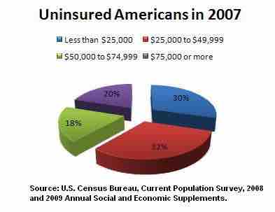 This image shows the income distribution of Americans who did not have health insurance coverage in 2007. The data comes from the U.S. Census Bureau's Current Population Survey in 2008 and the 2009 Annual Social and Economic Supplements–-available here (page 21).