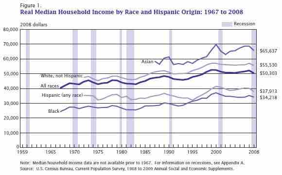 This image illustrates U.S. real median household income per year by race and ethnicity from 1967 to 2008, as compiled by the U.S. Census Bureau.