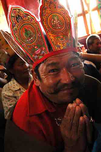 An apparently happy man wears the 5 Dhyani Buddhas Crown and holds a Flower and Dorje (vajra).