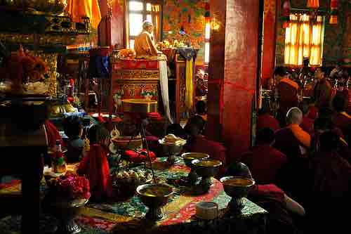 His Holiness Jigdal Dagchen Sakya leading the empowerment into practice at Tharlam Monastery, Boudha, Kathmandu, Nepal.