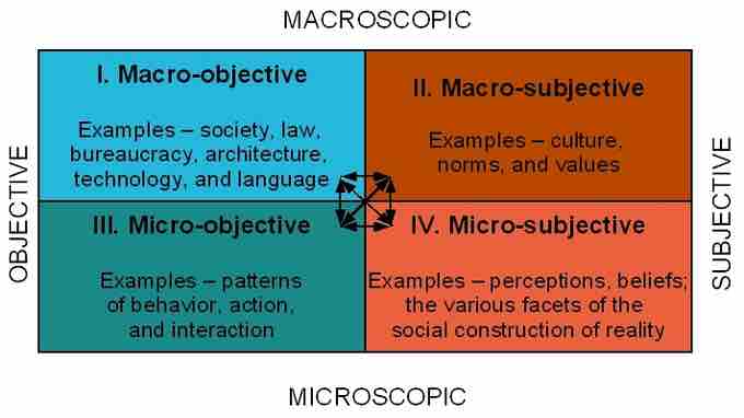Sociological analysis can take place at the macro or micro level, and can be subjective or objective.