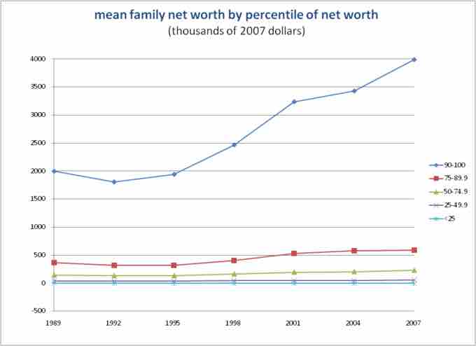 This graph shows changes in the average net worth of families in each decile of the U.S. income hierarchy. In recent years, the average net worth of high-income families has grown significantly more than that of middle and lower-income families.