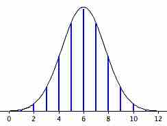 The normal approximation to the binomial distribution for 12 coin flips. The smooth curve is the normal distribution. Note how well it approximates the binomial probabilities represented by the heights of the blue lines.