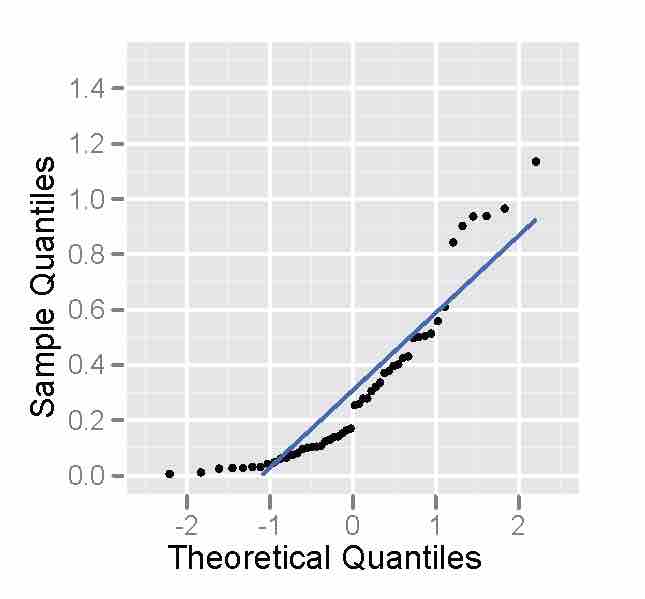 This is a sample of size 50 from a right-skewed distribution, plotted as a normal probability plot. Notice that the points deviate on the, indicating the distribution is not normal.