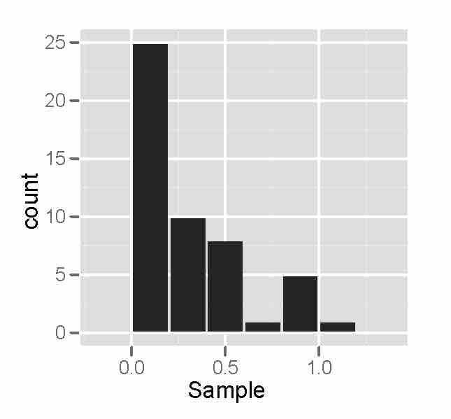 This is a sample of size 50 from a right-skewed distribution, plotted as a histogram. Notice that the histogram is not bell-shaped, indicating that the distribution is not normal.