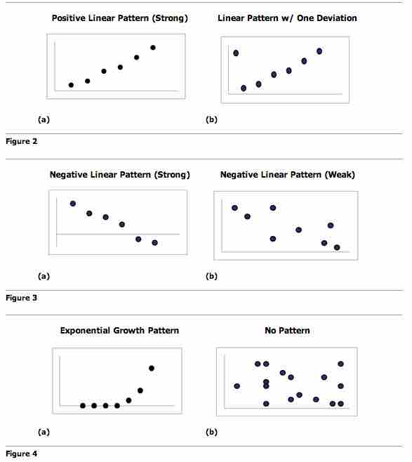 You can determine the strength of the relationship by looking at the scatter plot and seeing how close the points are to a line, a power function, an exponential function, or to some other type of function. When you look at a scatterplot, you want to notice the overall pattern and any deviations from the pattern. The following scatterplot examples illustrate these concepts .