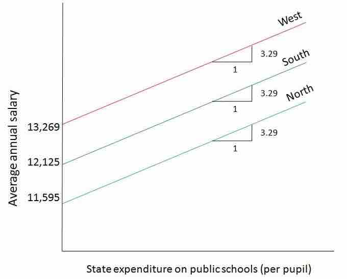 Graph showing the regression results of an ANCOVA model example: Public school teacher's salary (Y) in relation to state expenditure per pupil on public schools.