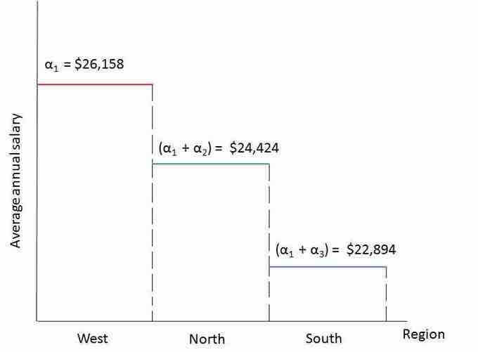Graph showing the regression results of the ANOVA model example: Average annual salaries of public school teachers in 3 regions of a country.