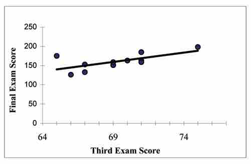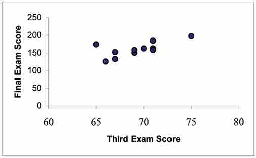 Here is a scatter plot that shows a correlation between ordinary test scores and final exam test scores for a statistics class:
