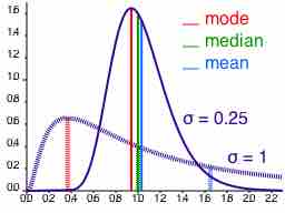 Comparison of mean, median and mode of two log-normal distributions with different skewness.