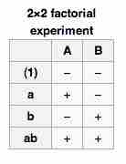 To save space, the points in a two-level factorial experiment are often abbreviated with strings of plus and minus signs. The strings have as many symbols as factors, and their values dictate the level of each factor: conventionally,