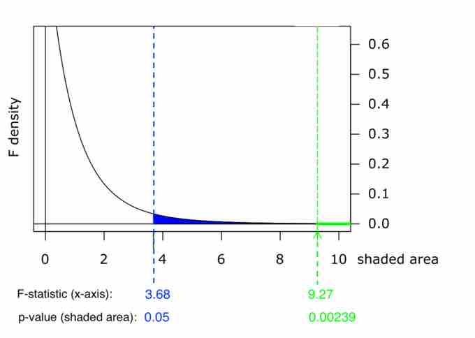 This chart shows example p-values for two F-statistics: p = 0.05 for F = 3.68, and p = 0.00239 for F = 9.27. These numbers are evidence of the skewness of the F-curve to the right; a much higher F-value corresponds to an only slightly smaller p-value.