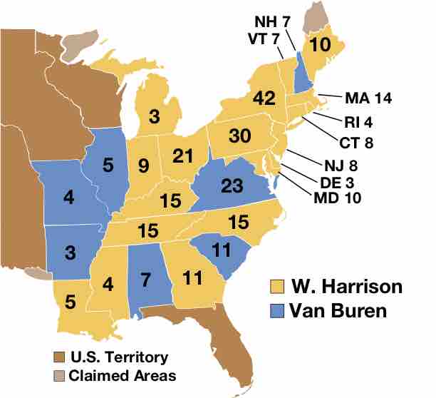 Presidential election results map: Orange denotes states won by Harrison/Tyler, Blue denotes those won by Van Buren and one of his three running mates. Numbers indicate the number of electoral votes allotted to each state.