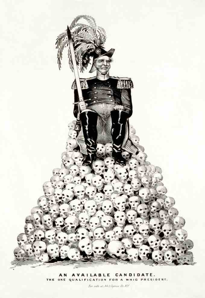 "An Available Candidate: The One Qualification for a Whig President." This political cartoon about the 1848 presidential election refers to Zachary Taylor and Winfield Scott, the two leading contenders for the Whig Party nomination in the aftermath of the Mexican-American War. Published by Nathaniel Currier in 1848.