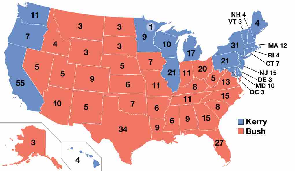 Presidential election results map. Red denotes states won by Bush/Cheney, Blue denotes those won by Kerry/Edwards. The split vote in Minnesota denotes an elector's vote counted for Vice President nominee John Edwards. Each number represents the electoral votes a state gave to one candidate.