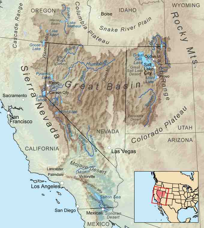 The Great Basin is a multi-state endorheic area surrounded by the Pacific Watershed of North America, home to the pre-Columbian indigenous peoples of the Great Basin.