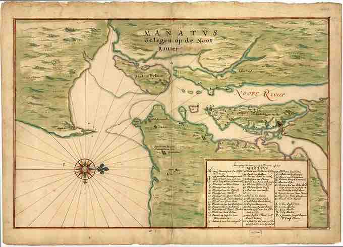 In this map (c. 1639), Manhattan is situated on the North River.