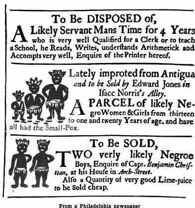 This Philadelphia newspaper advertises the sale of an indentured servant's labor, followed below by advertisements for various slaves. This illustrates the difference between indentured servitude (in which a person's labor is owned) vs. slavery (in which a person is owned).