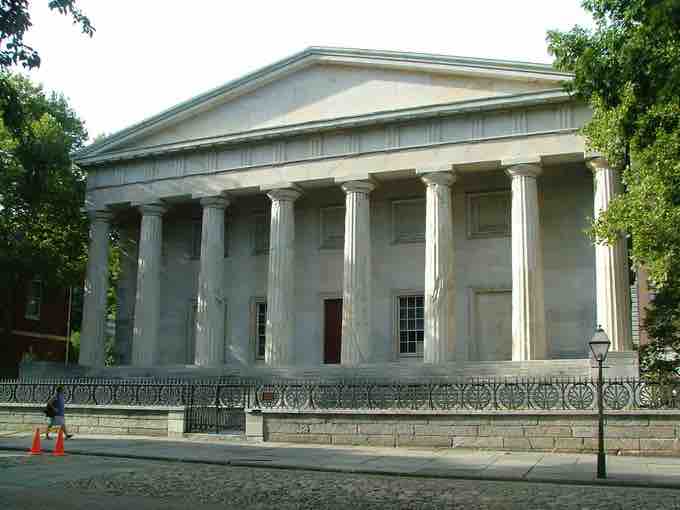 The south facade of the building that housed the Second Bank of the United States is located at 4th and Chestnut Streets in Independence National Historical Park, Philadelphia, Pennsylvania.