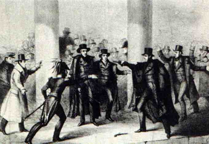 This 1835 etching depicts Richard Lawrence's assassination attempt on Andrew Jackson.