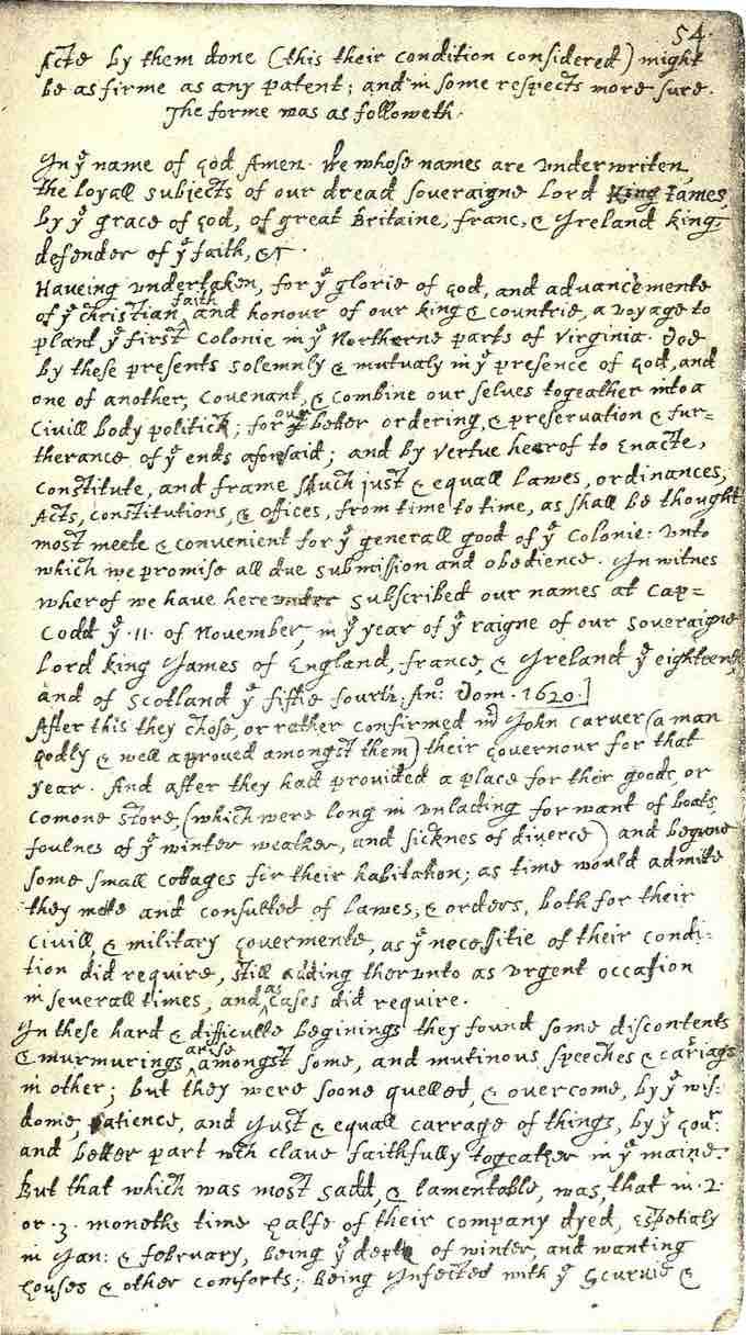 Copy of the text of the Mayflower Compact created by William Bradford ca. 1645