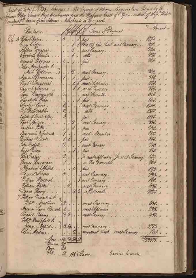 Ledger of sale of 118 slaves, Charleston, South Carolina, c. 1754.