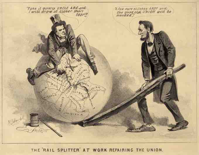 A political cartoon of Andrew Johnson and Abraham Lincoln, 1865, entitled "The 'Rail Splitter' At Work Repairing the Union." The caption reads (Johnson): "Take it quietly Uncle Abe and I will draw it closer than ever!!" (Lincoln): "A few more stitches Andy and the good old Union will be mended!"