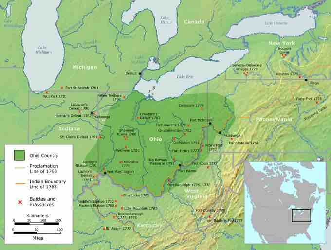 This map depicts the battles and massacres that occurred within Ohio Country between 1775 and 1794.