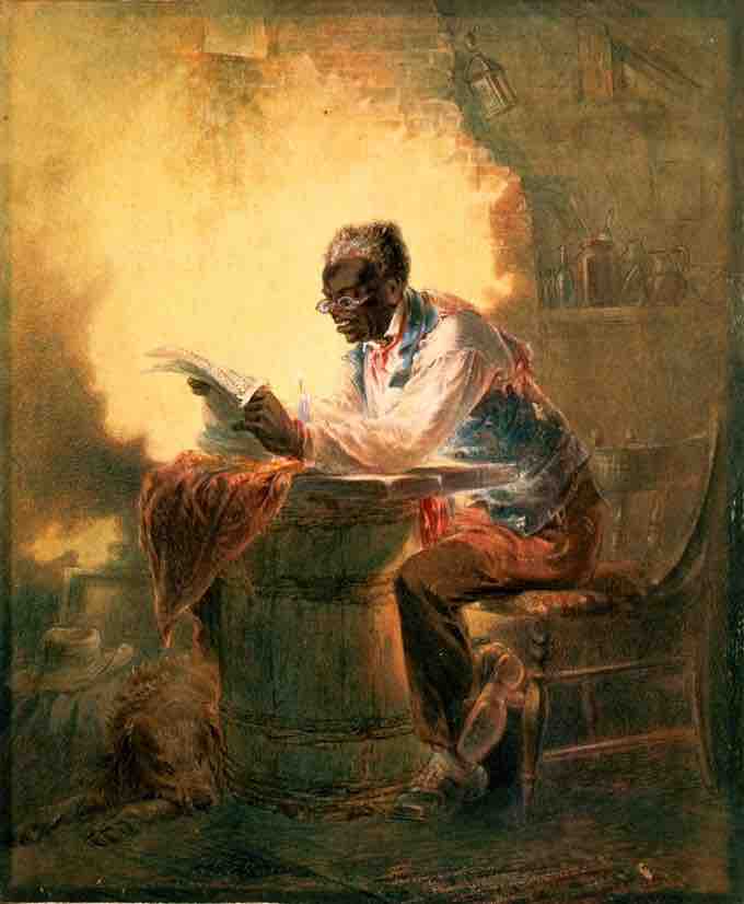 Henry Louis Stephens's untitled watercolor (ca. 1863) of a man reading a newspaper with the headline, "Presidential Proclamation/Slavery."