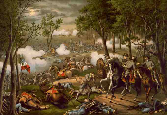 Battle of Chancellorsville by Kurz and Allison depicts the wounding of Confederate Lt. Gen. Stonewall Jackson on May 2, 1863.